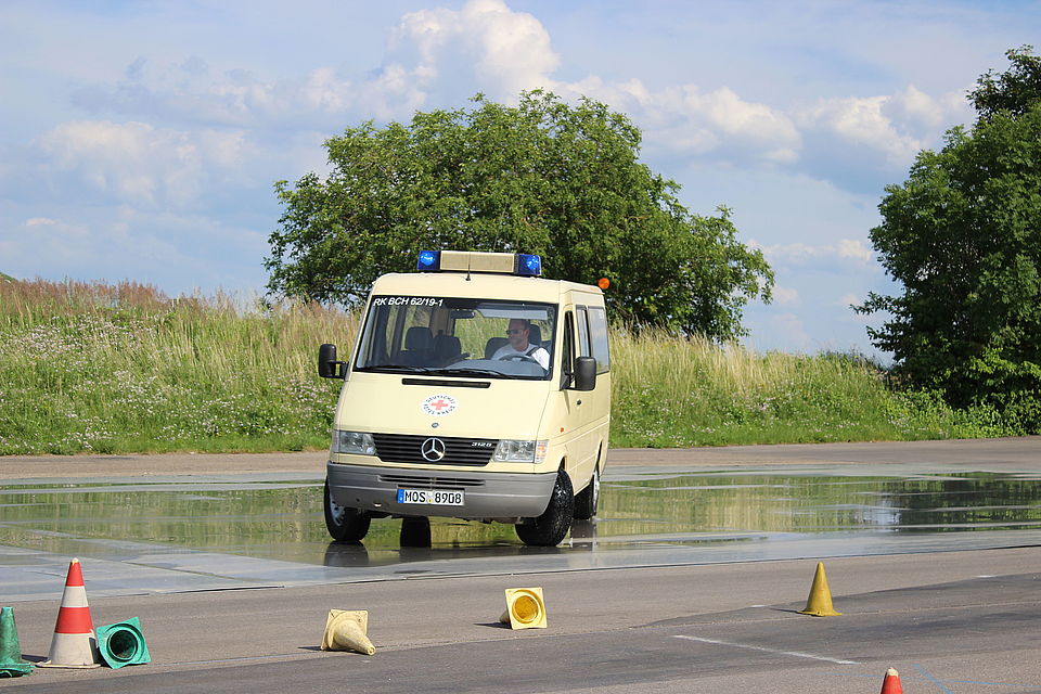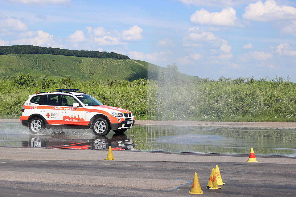 "Es ist eine wertvolle Erfahrung dies zu trainieren, damit unsere Einsatzkräfte in Drucksituationen wissen, wie sie reagieren können", berichtet Dominic Burger-Graseck, Kreisbereitschaftsleiter im DRK KV Buchen, der das Training in Zusammenarbeit mit der Kreisverkehrswacht Heilbronn organisiert hat. Dann müsse der Autopilot im Kopf anspringen, der kräftig bremst, das Fahrverhalten des Einsatzfahrzeuges kennt und die Lenkbewegungen an die Geschwindigkeit anpasst, so Burger-Graseck weiter. So wurde immer wieder geübt, unvorhergesehenen Fahrbewegungen anderer Fahrzeuge oder spät auszumachenden Hindernissen auszuweichen und dabei stets die Kontrolle über das Fahrzeug zu behalten - auch bei Nässe, spiegelglatter Fahrbahn und anderen Umwelteinflüssen. "Ein Einsatzfahrzeug kann auch mal mit 120 km/h unterwegs sein, um Patienten schnell zu erreichen", so Burger-Graseck, der selbst regelmäßig Einsatzfahrten absolviert. Die Sicherheit der Fahrer und der Verkehrsteilnehmer sei dabei entscheidend: Über eine Ampelkreuzung fahre man nicht, ohne vorher abzubremsen. Es gelte, die jeweils vorgeschriebene Geschwindigkeit nicht um mehr als die Hälfte zu überschreiten.