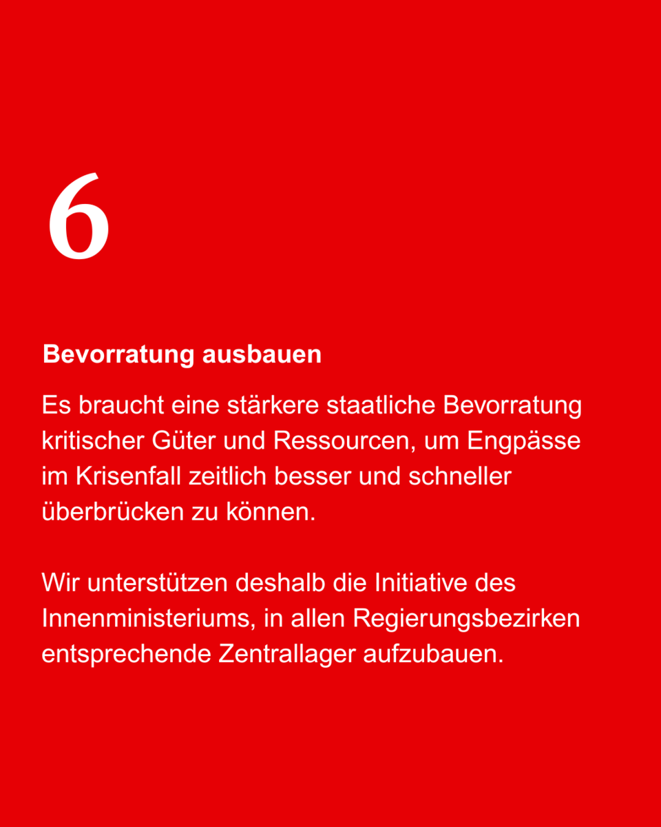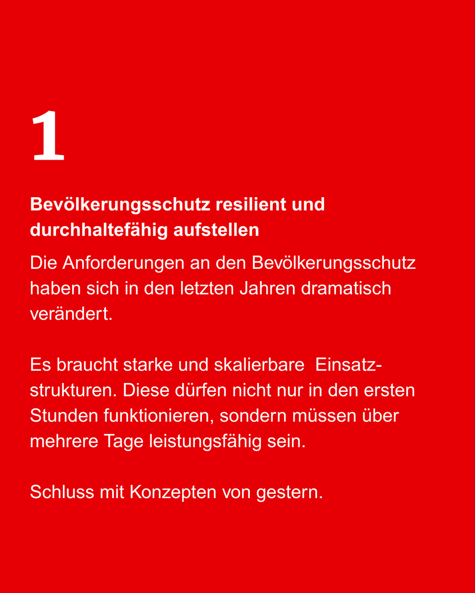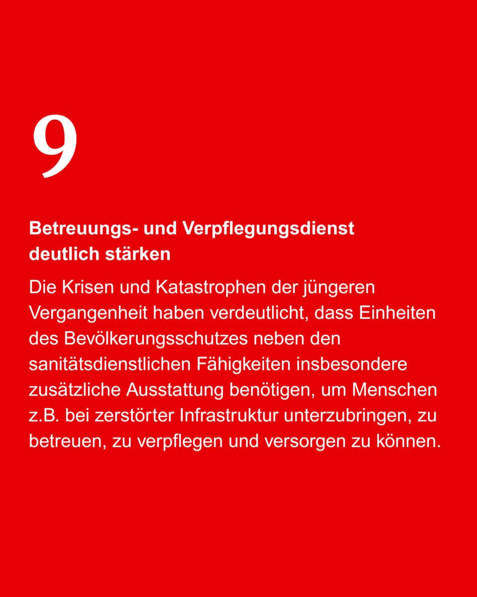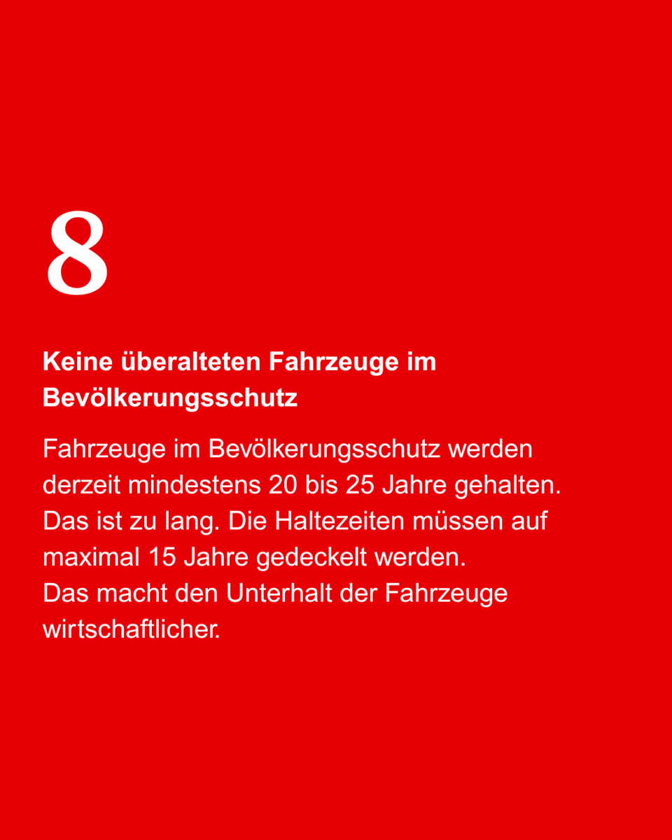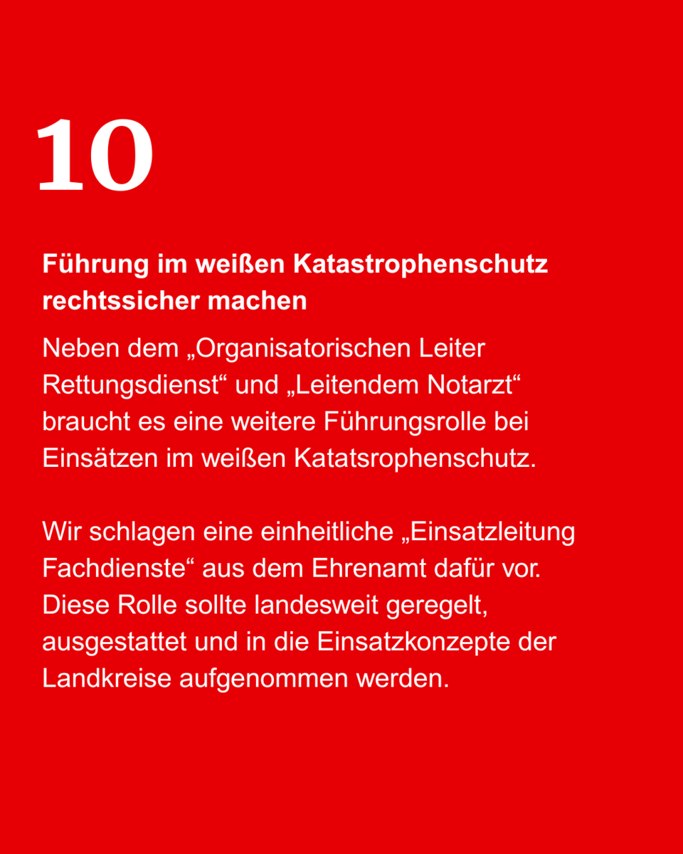 Wir möchten kleinere, modular kombinierbare Einheiten mit klaren Leistungsprofilen (Sanität, Betreuung, Verpflegung, Logistik) einführen. Ergänzend soll die Einsatzleitung Fachdienste landesweit einheitlich geregelt und ausgestattet werden. Damit beschleunigen wir die Alarmierung, erhöhen die Skalierbarkeit und ermöglichen autarke Hilfe auch über mehrere Tage. Weitere Punkte – von Bevorratung und Zentrallagern über Bürokratieabbau bis zu realistischen Fahrzeuglebenszyklen und klaren Führungsrollen – haben wir im Carousel zusammengefasst.