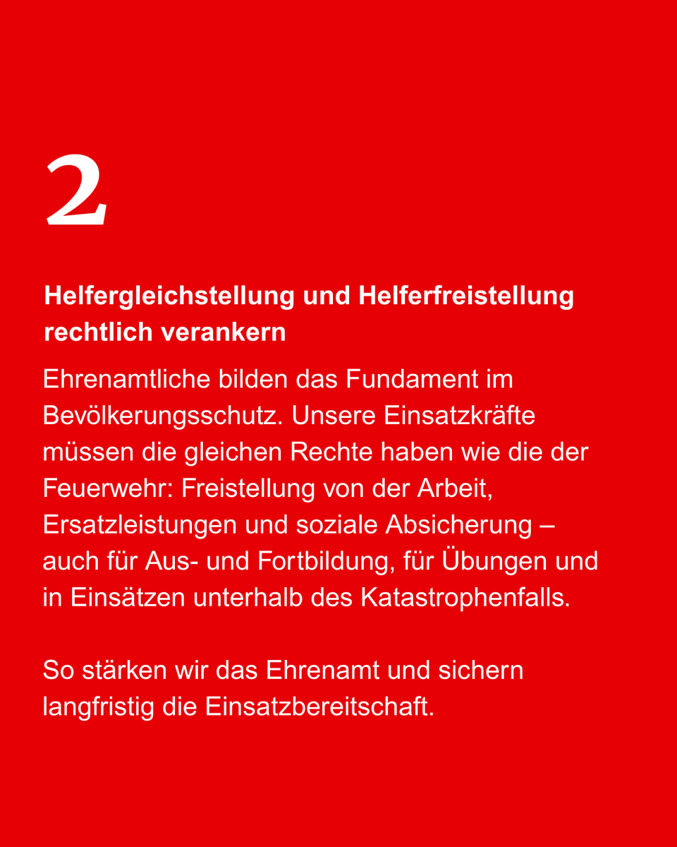 Wir fordern die rechtlich gleiche Behandlung wie bei der Feuerwehr. Einsatzkräfte der Hilfsorganisationen werden verbindlich für Einsätze, Ausbildung und Übungen freigestellt, Verdienstausfälle werden erstattet und Arbeitgeber erhalten klare, einheitliche Informationen. Dadurch entsteht Planungssicherheit für alle Beteiligten und die Einsatzbereitschaft steigt.