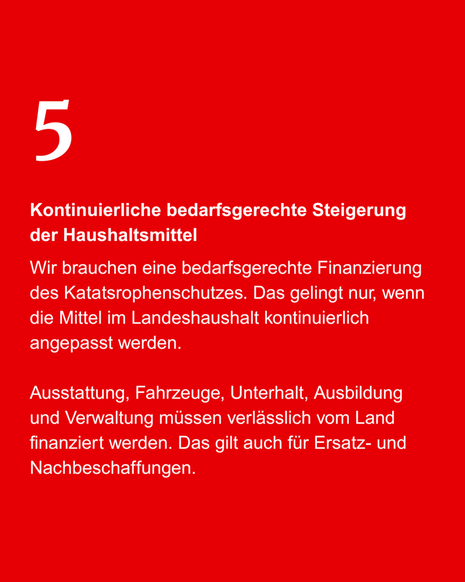 Wir schlagen vor, dass das Land die Kosten für Ausstattung, Fahrzeuge einschließlich Unterbringung und Unterhalt, die Ausbildung sämtlicher Einsatz- und Führungskräfte sowie die notwendigen Verwaltungskosten vollständig und planbar übernimmt. Dazu gehört ein verlässlicher Ersatz- und Nachbeschaffungszyklus
